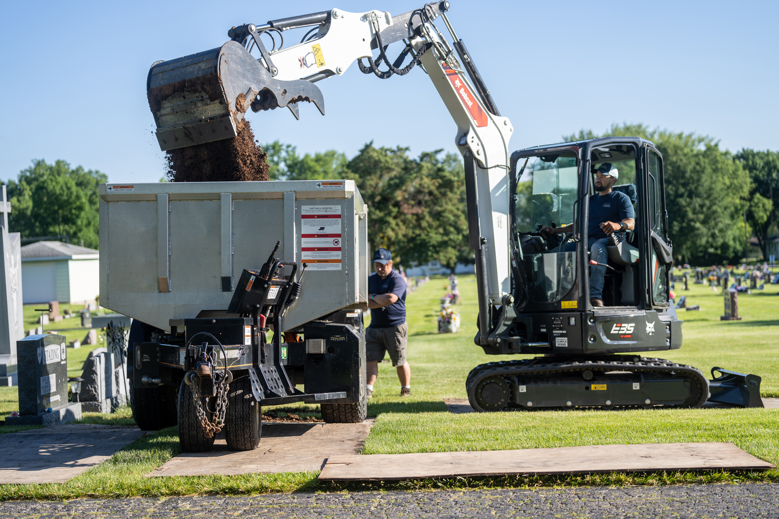 Soil Management: When excavating a gravesite, the Equipter can be positioned immediately next to the dig. You can load soil directly into the unit and drive it to a pile or dump truck, keeping the immediate area clean and accessible for services.